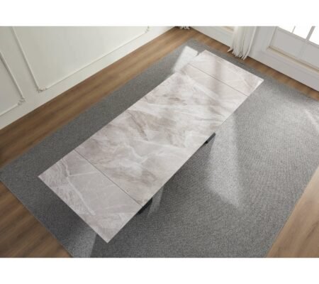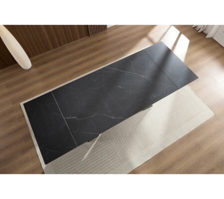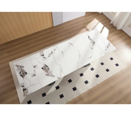 Prețul inițial a fost: 3.890,00 lei.3.249,00 leiPrețul curent este: 3.249,00 lei.Masa extensibila DONNA, blat piatra sinterizata, 180-260x90x75 cm, alb efect marmura/gri inchis